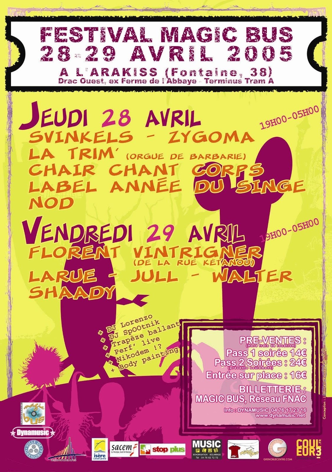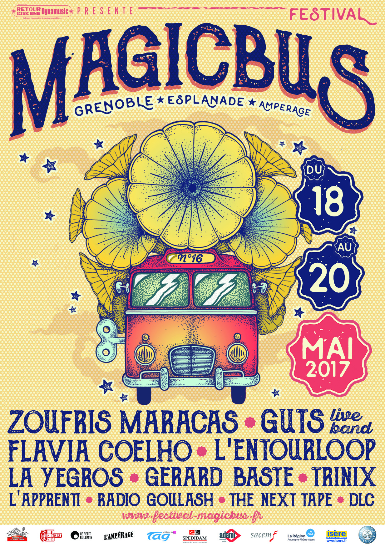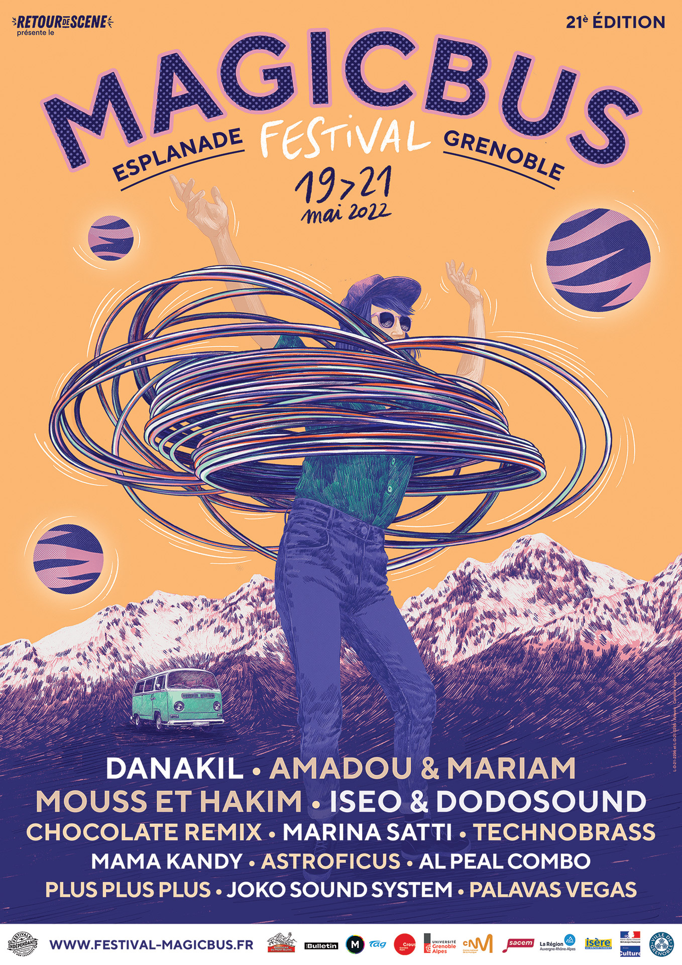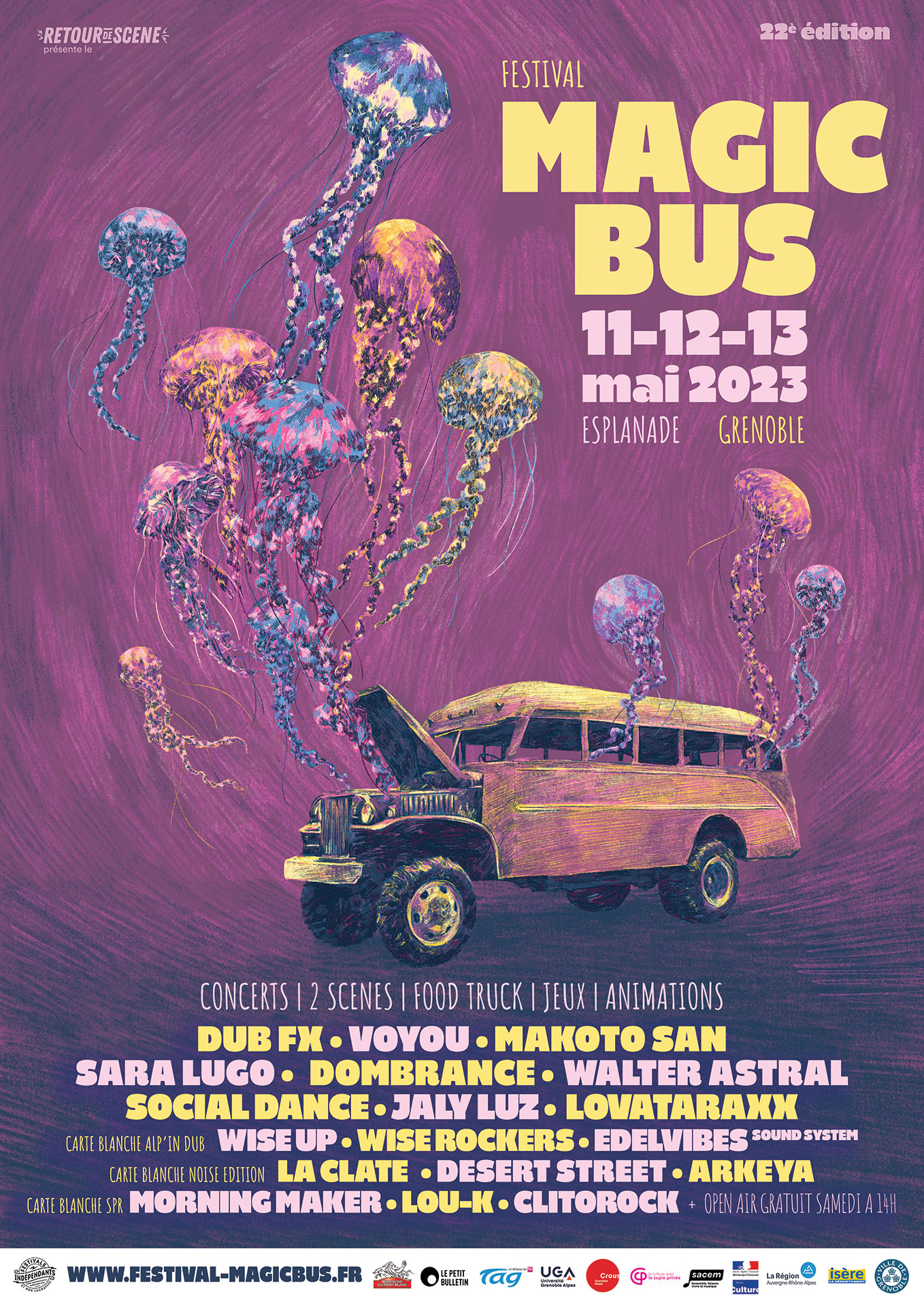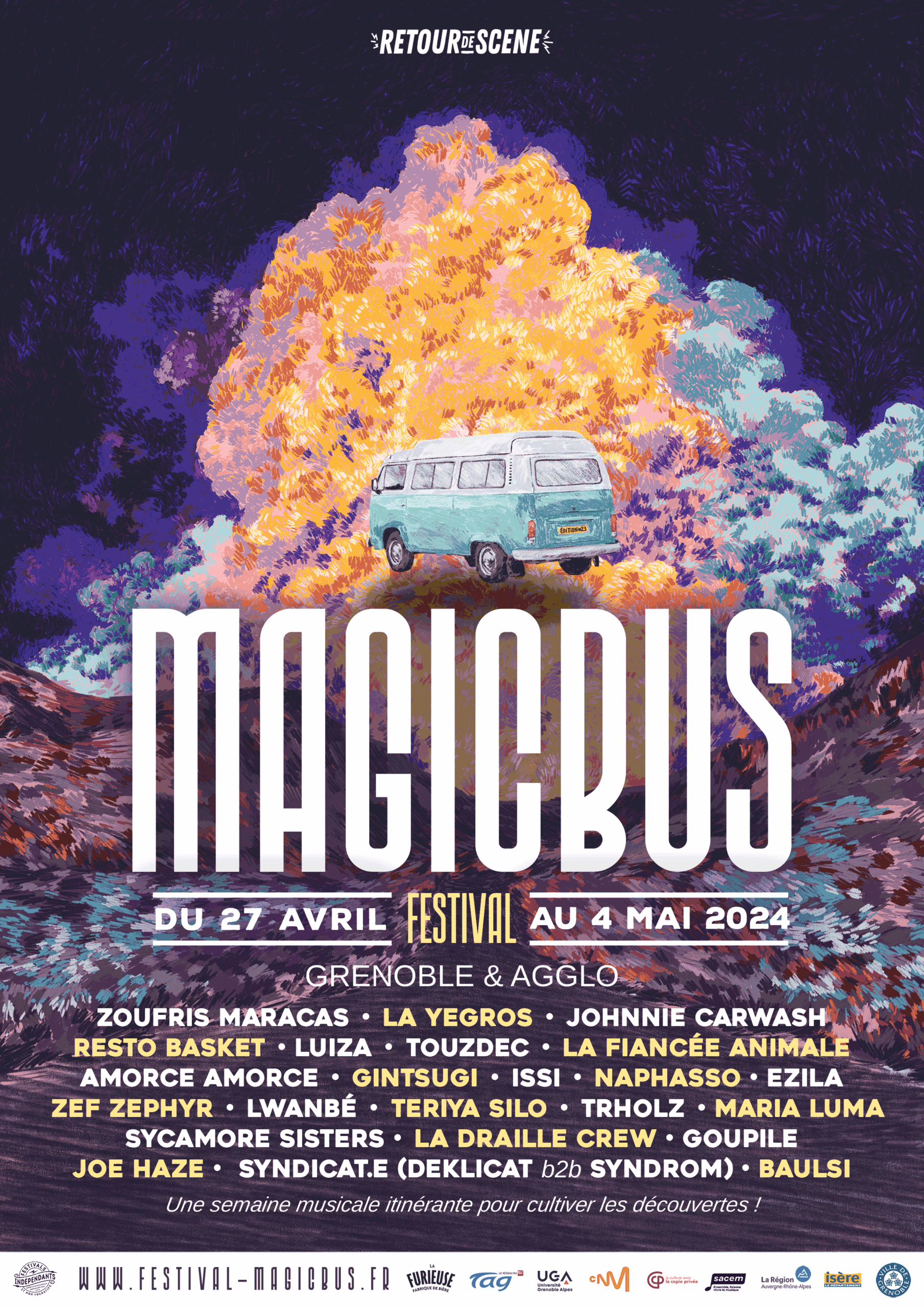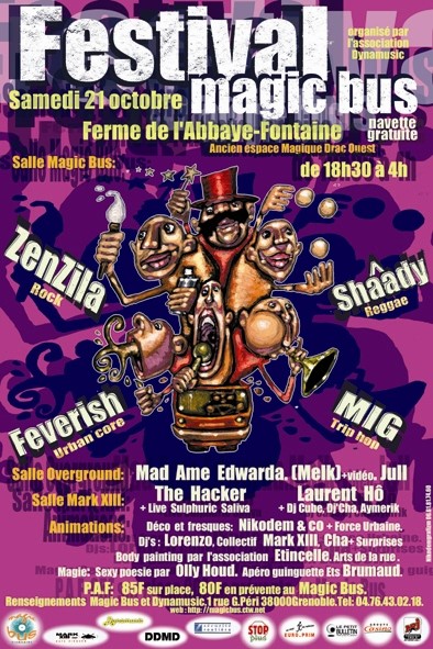 Magic Bus est un festival de musiques actuelles itinérant, qui a lieu chaque année au mois de avril/mai, à Grenoble. La première édition eu lieu en 1999 afin de soutenir le disquaire indépendant « Magic Bus » et de mettre en lumière la scène locale florissante de l’agglomération. 25 ans plus tard, Magic Bus se veut toujours un rendez-vous chaleureux, convivial et dédié à la découverte d’une programmation ouverte aux différentes esthétiques musicales.